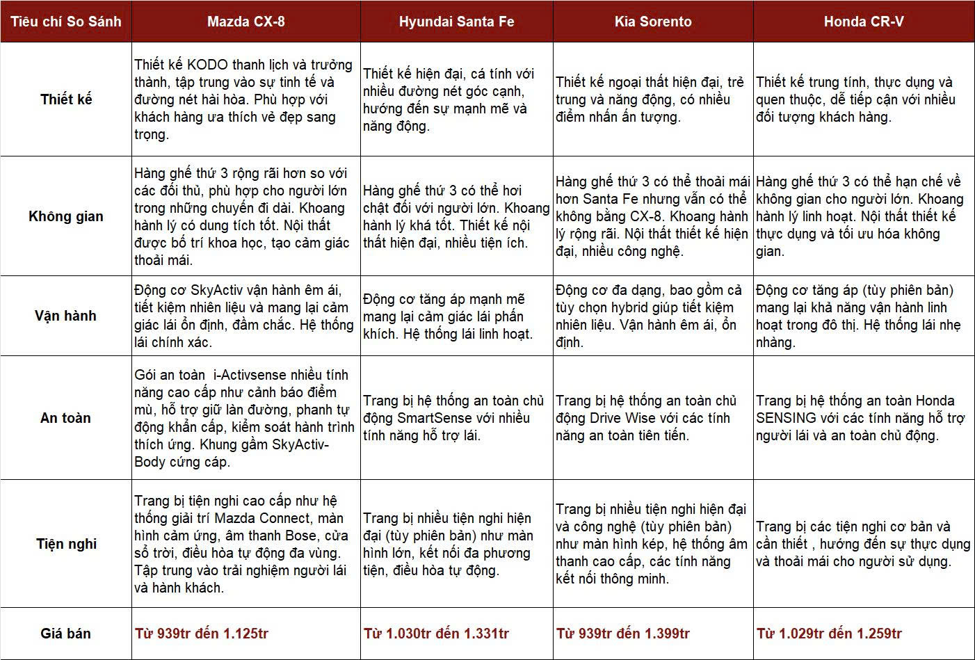 Cùng em Thuận tham khảo bảng so sánh CX8 với các dòng xe cùng phân khúc: